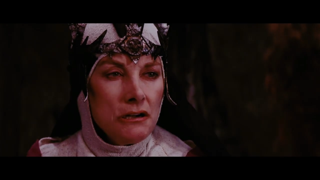 I want to say that Queen Bavmorda is straight up intimidating. If she were to walk past, I’m jumping into a barrel and crying softly. Queen Bavmorda is a tall woman with some pale ass skin. She looks to be in her fifties, but her face looks like she is tired and needs a nap. She usually wears fancy dark blue robes or cloaks with a white scarf that covers her head. What makes her intimidating is her crown. You need to look at that thing. It is white with thorn-like spikes on the side.
